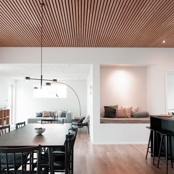 A ceiling doesn't have to be boring and you can create a completely different space by thinking about your choice of ceiling. The ceiling is a big part of a room and by changing it, you can create a completely different atmosphere for the whole room. So if you are tired of your old wooden ceiling or all-white ceiling, I⋅WOOD ACOUSTIC CEILING is the perfect solution for you