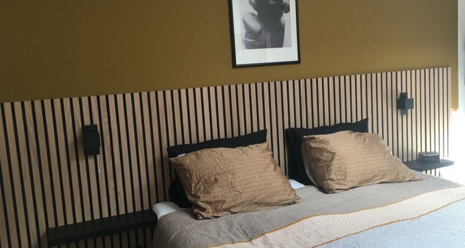 You can use acoustic panels for your headboard by laying them horizontally and creating lines that follow the surfaces of other furniture such as the bed and bedside tables. Choose the height that best suits your space. Consider how else the room will be arranged when choosing the height. Do bedside tables and bedside lamps need to be mounted on the wall panel? Then, of course, you have to remember to leave plenty of room for that.