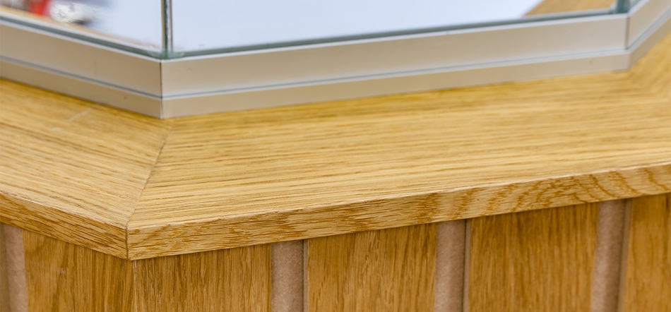 The combination of natural wood elements finished with clear oil on A-veneer and the brown felt creates a visual calm that perfectly complements the store’s products.