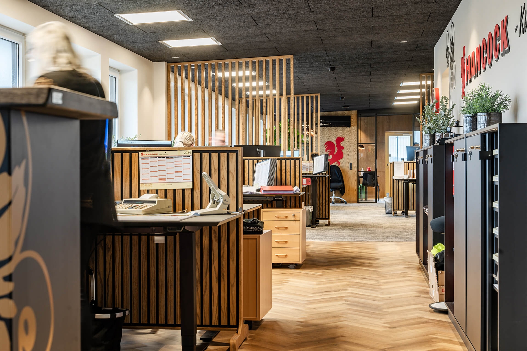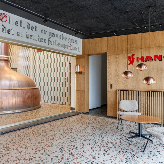 I-Wood Denmark® has, with its stylish acoustic panels, created a modern and inviting atmosphere in the Hancock breweries' offices. The prominent wood surfaces add an exclusive touch that beautifully complements the copper brewing vessels, offering a contemporary interpretation of 1950s decor. Simultaneously, the acoustic panels in both Flexi Frame and Flexi Wall improve office acoustics and optimal room division.