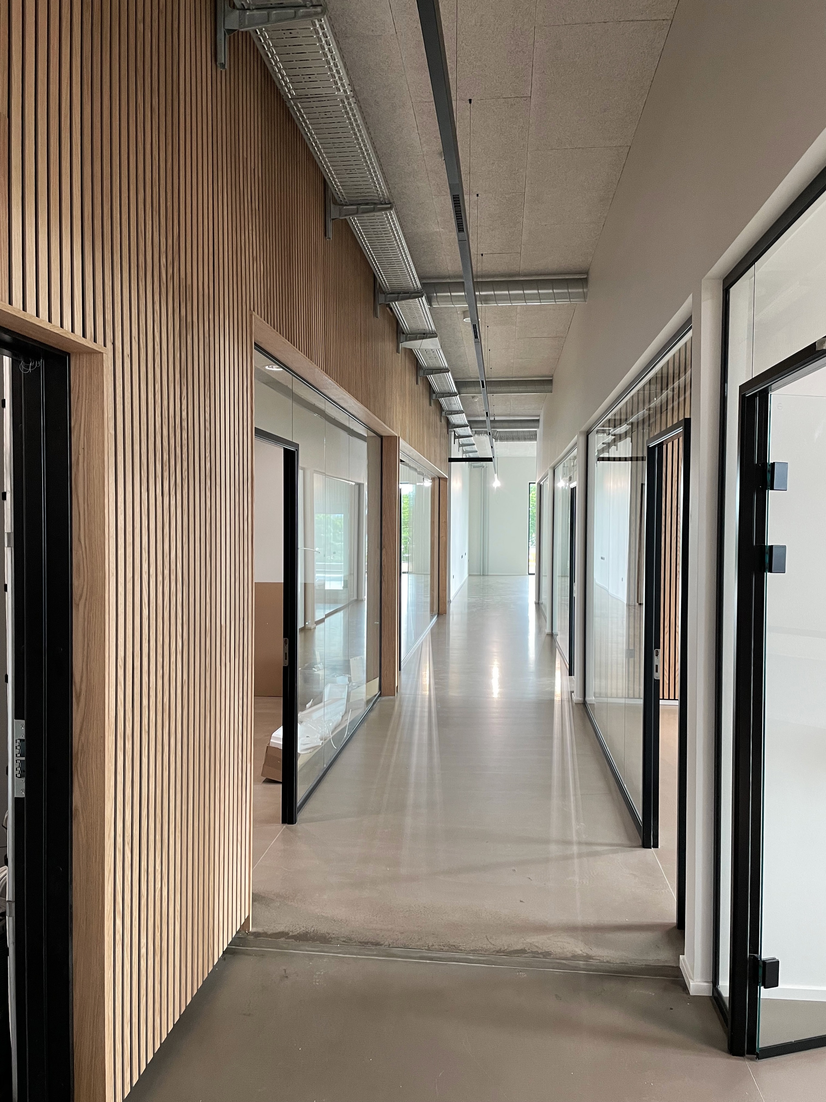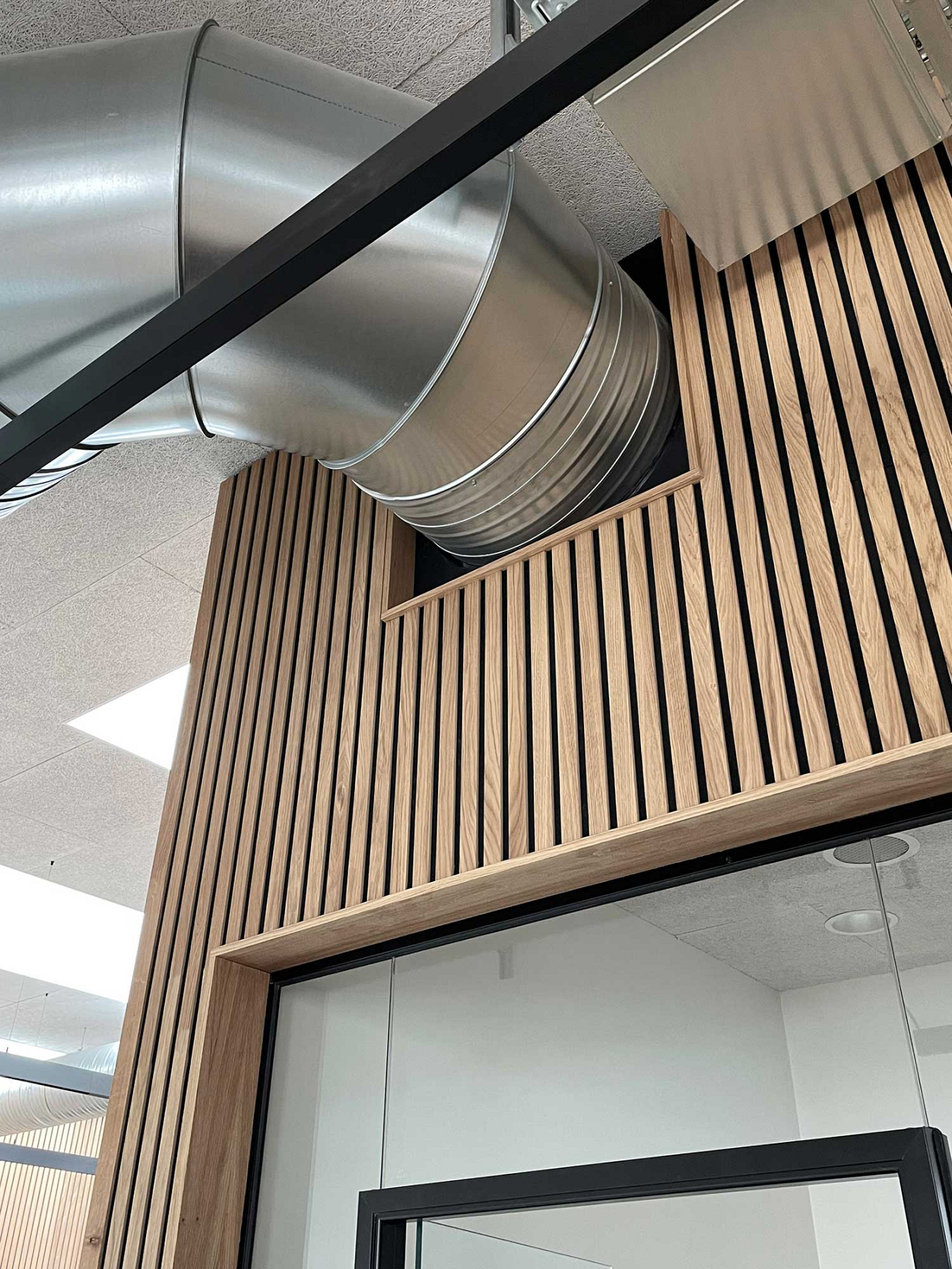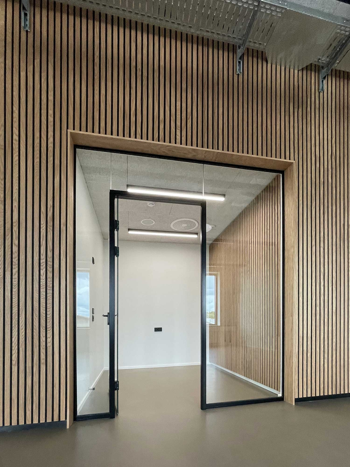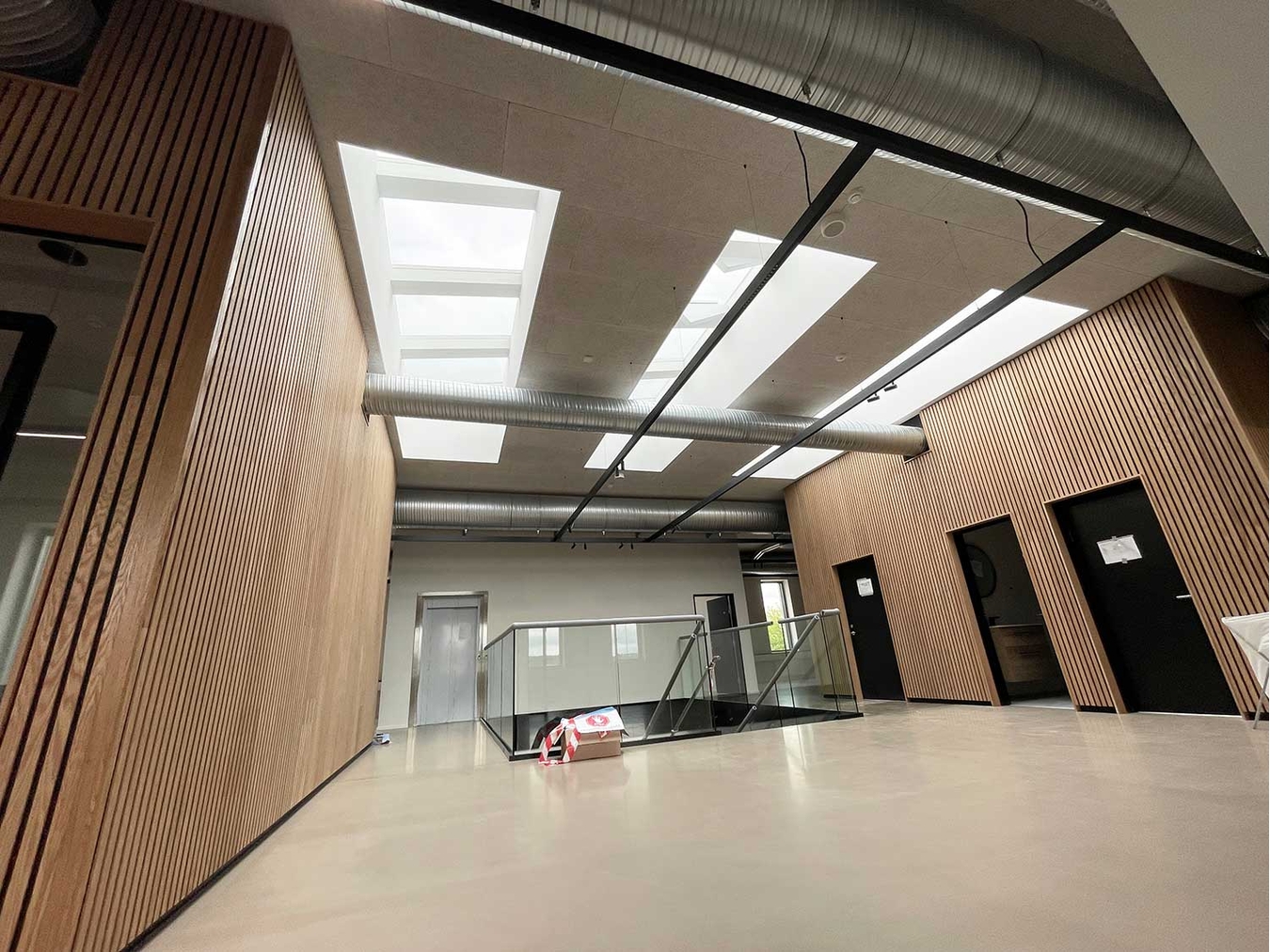 The new headquarters for Henning Mortensen A/S are located on Lillehøjvej in Silkeborg. As part of the project, I-Wood Denmark® has supplied acoustic panels for ceilings and walls for the new areas in the administration building.
