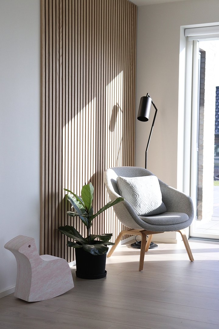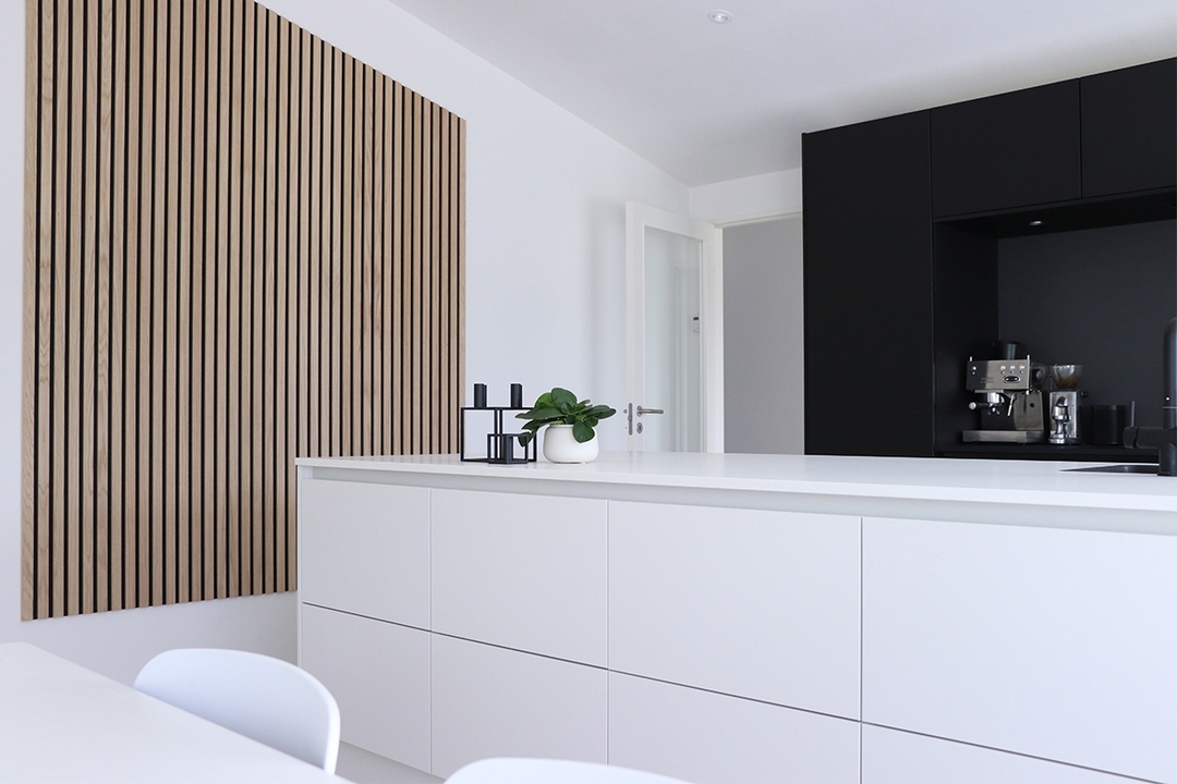 Instagrammer and influencer Louise Laursen created better acoustics in the home using wall panels from I-Wood Denmark®. Here, the good acoustics are mixed with beautiful aesthetics in the large, bright rooms in both the kitchen and living rooms.