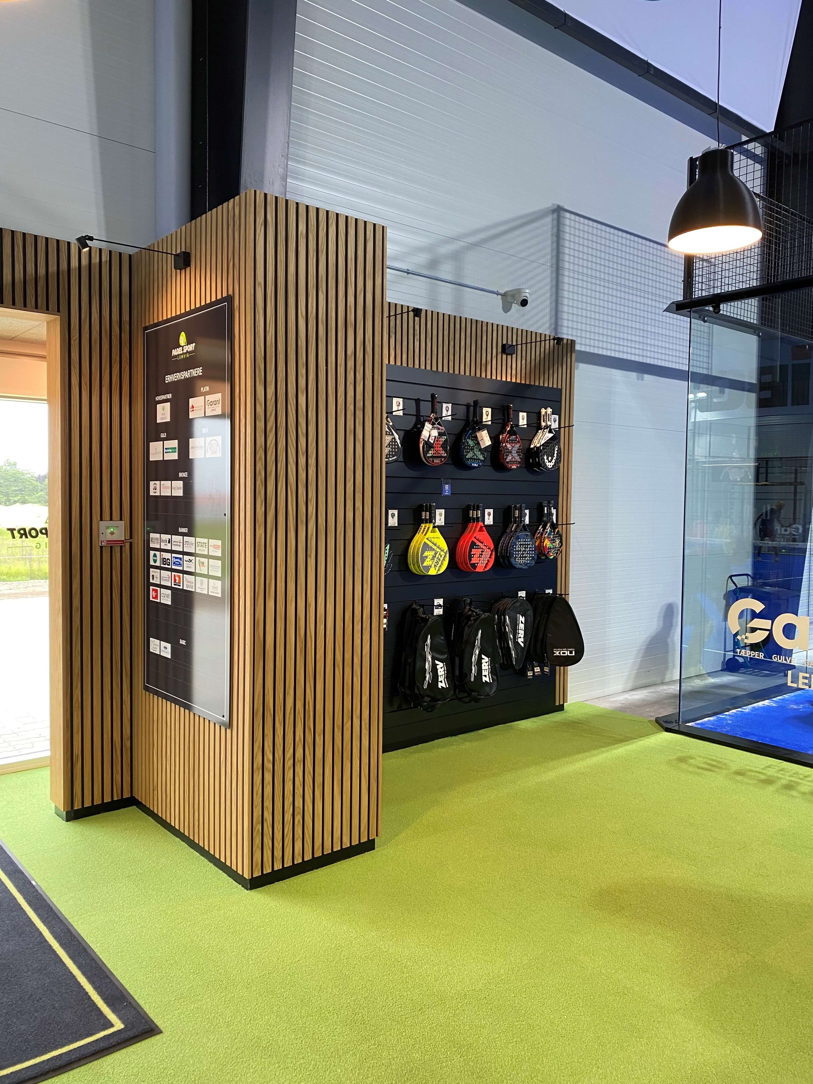 In the Jysk Energi Boxen, the biggest padel tennis centre in northwest Jutland, you will find wall panels from I-Wood Denmark®. They ensure this large hall has better acoustics. Several creative solutions were chosen, which is why you will also find the wall panels used on benches, counters and at the bar. The panels have a minimum fire classification of D-s2,d2 in accordance with EN 13823.