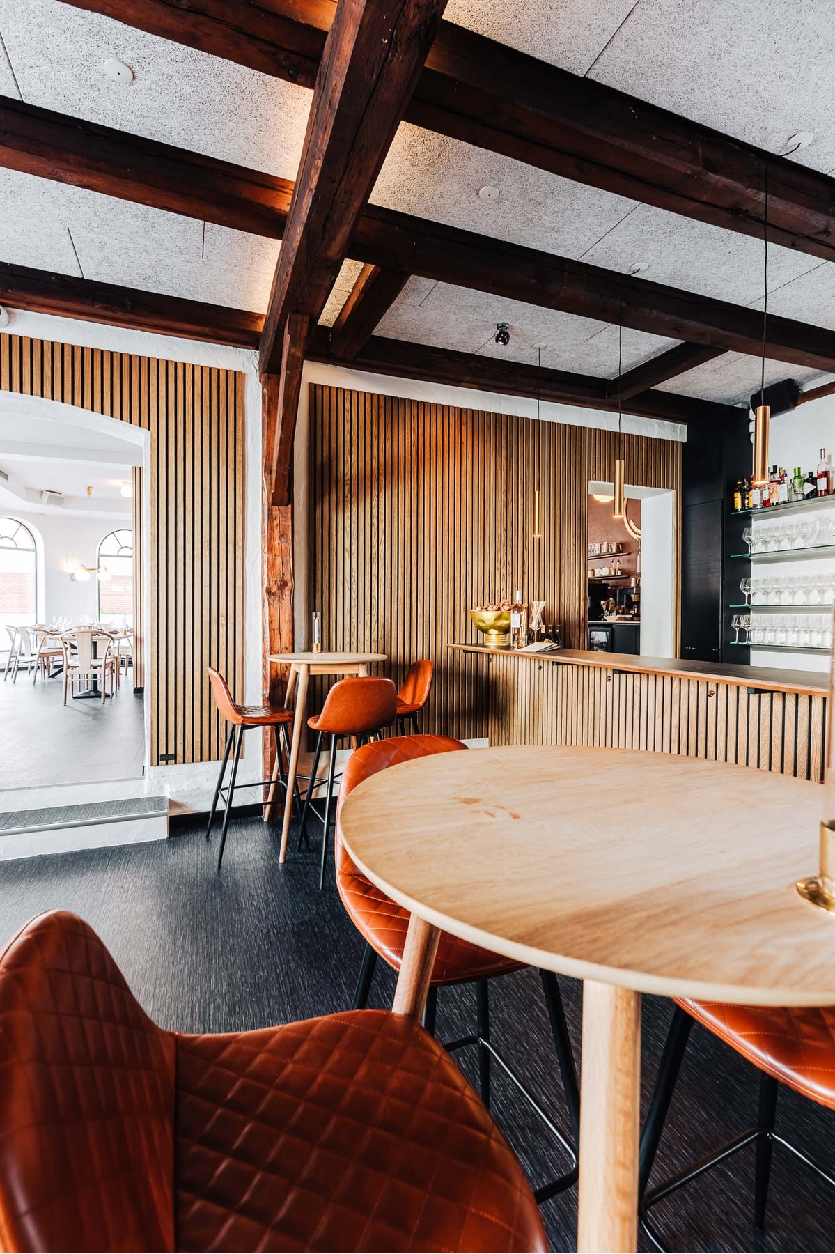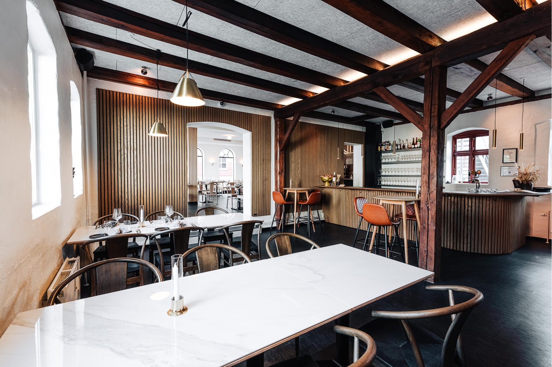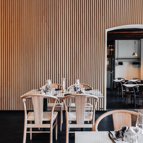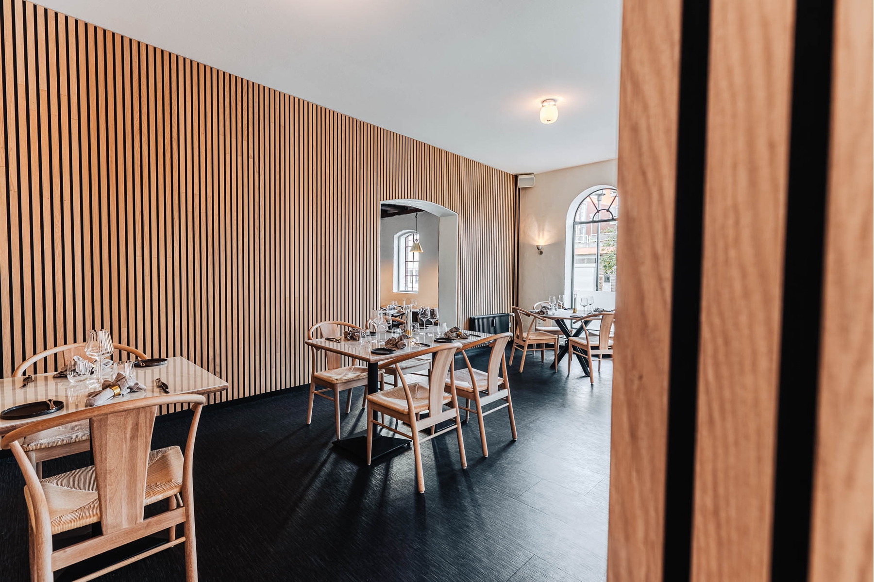 A brand-new gourmet restaurant in Holstebro. The job involved creating and implementing a certain style. They wanted to use wood and a Nordic style in the old buildings, so that it suited the style in their kitchen. They worked with the different colours from I-Wood to match with the different moods and with the furniture they had chosen.