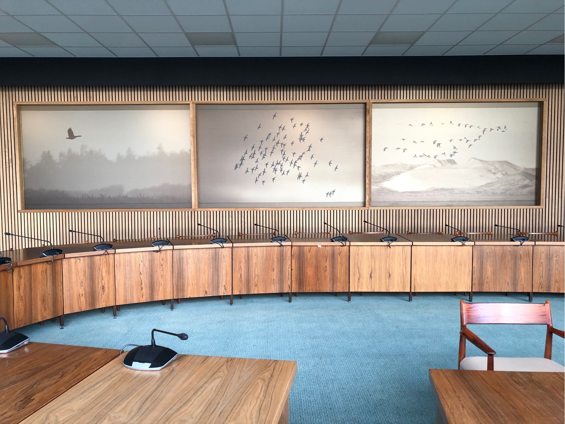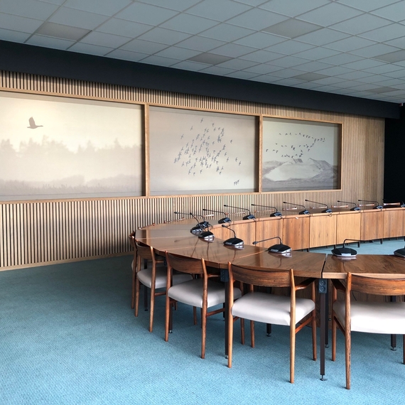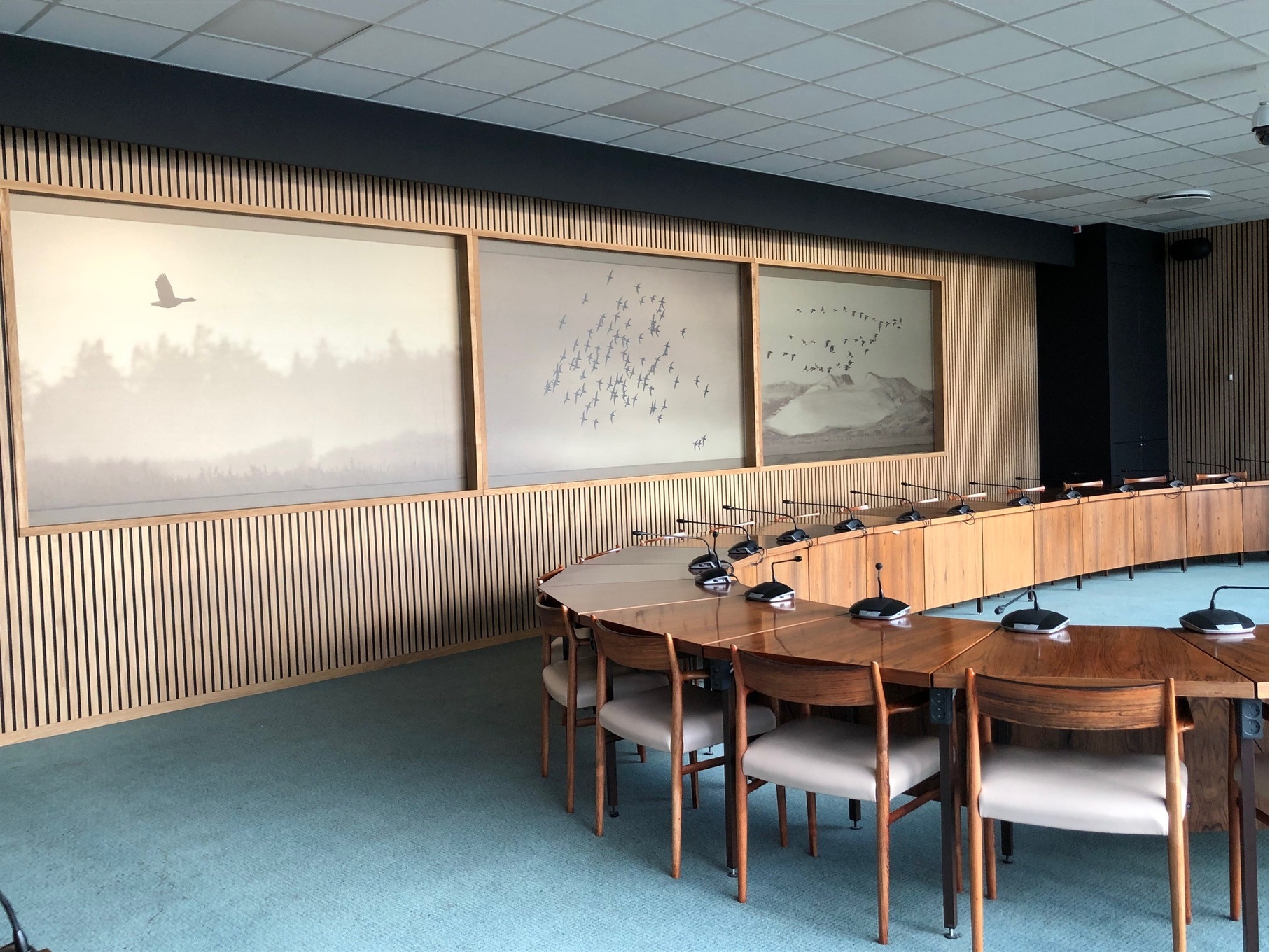 The dark wooden walls have been replaced with an acoustic wall in light oak slats, broken by three windows that let in light from the Town Hall. The windows are decorated with motifs inspired by nature.