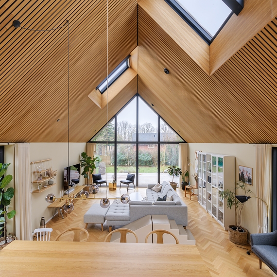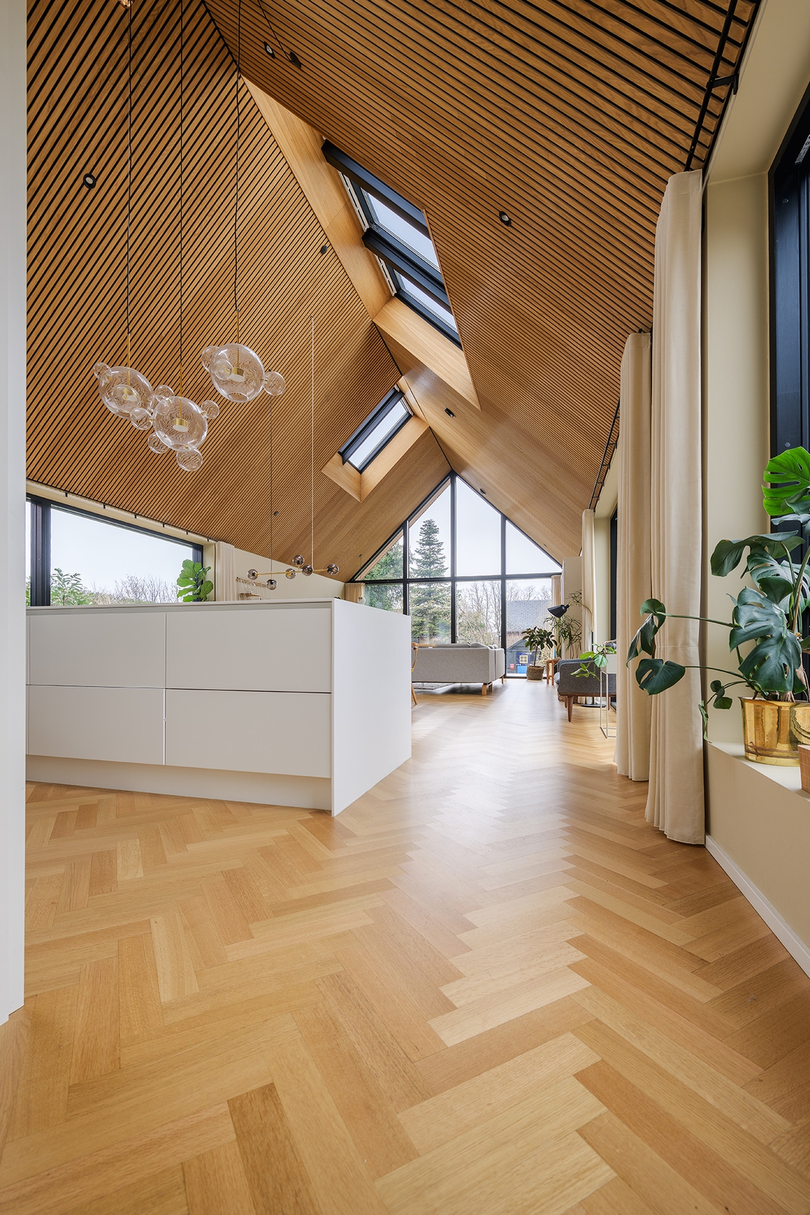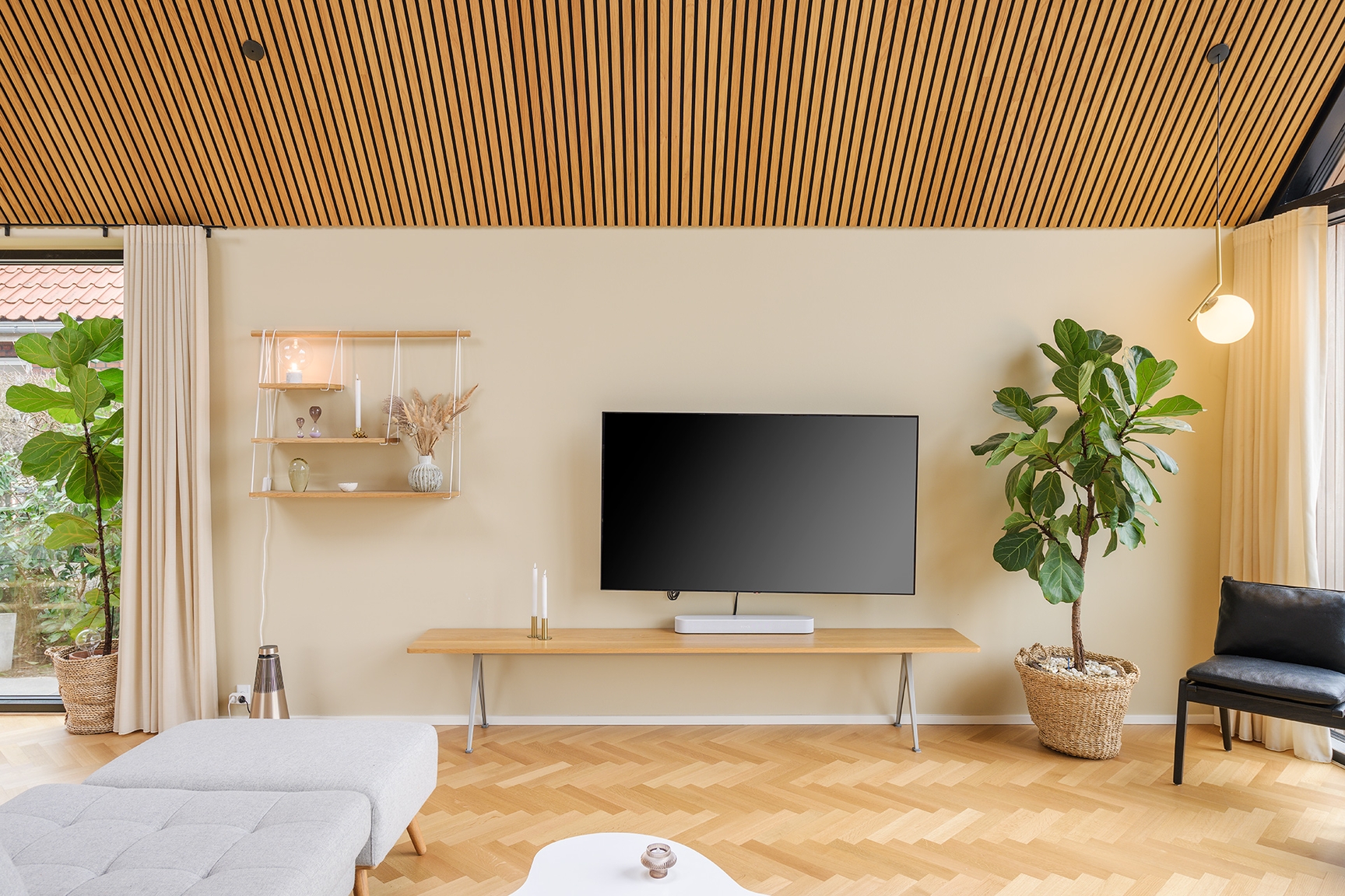 Sussi and Jens have created a completely new atmosphere and sense of space with their new ceiling panels. In a large living room with a high ceiling, the ceiling panels from I-Wood Denmark® especially help to give the room perfect acoustics and at the same time create a beautiful, natural and stylish look.