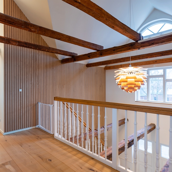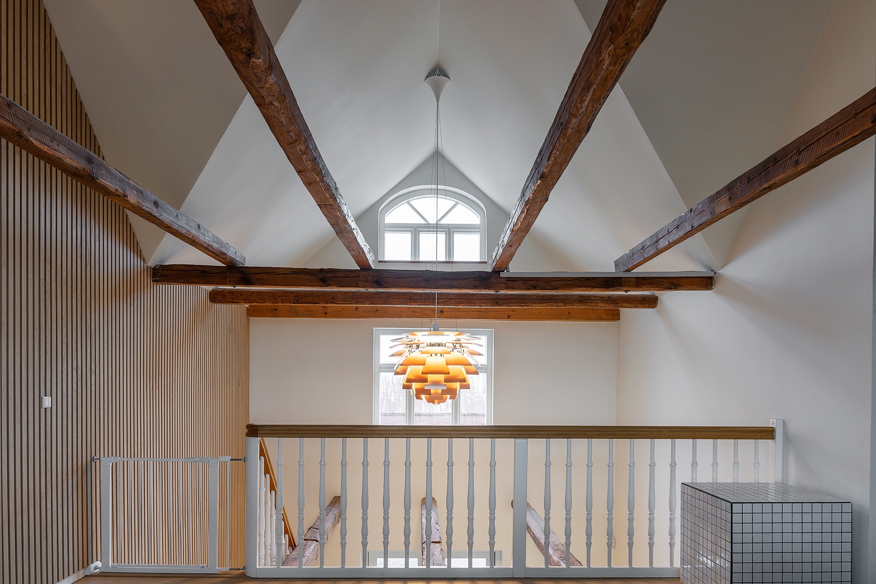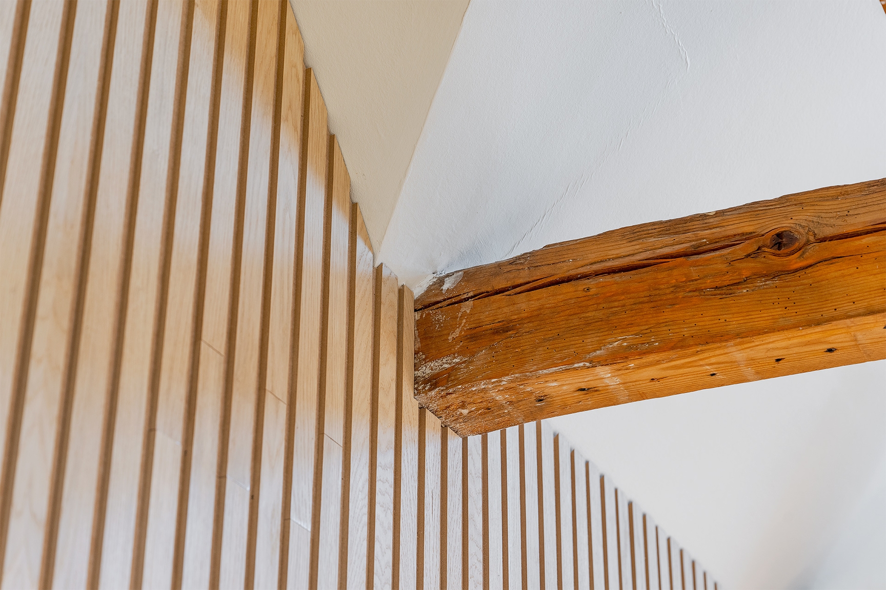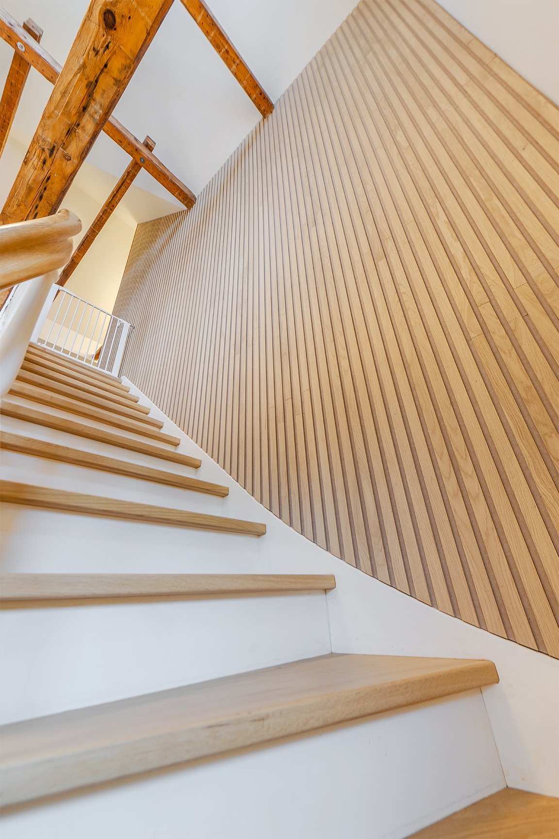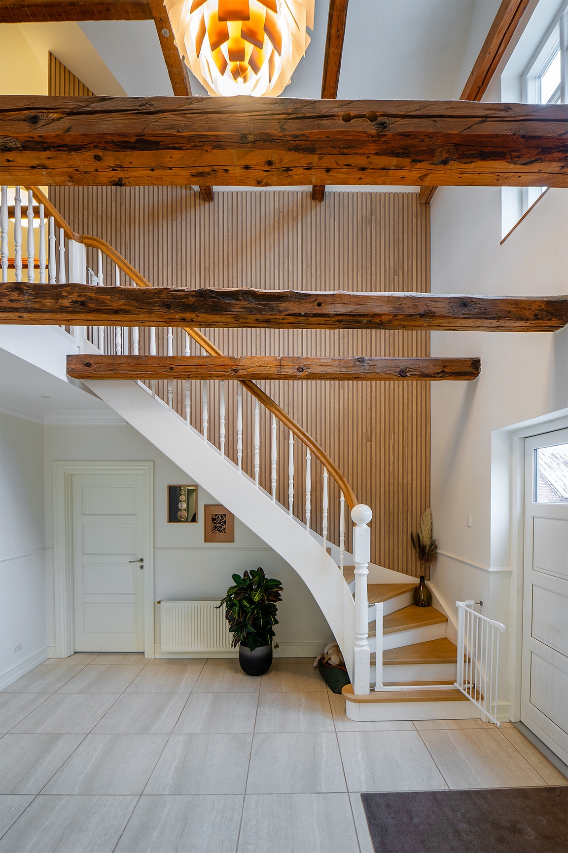 Wall panels with beige felt are mounted by the staircase to the first floor. The panels create an inviting atmosphere from the first step inside. The uniqueness of this project lies in the interplay between the modern panels and the original wooden beams. This contrast highlights the beautiful details of the finishes and creates a visual connection between the home's historical elements and modern design.