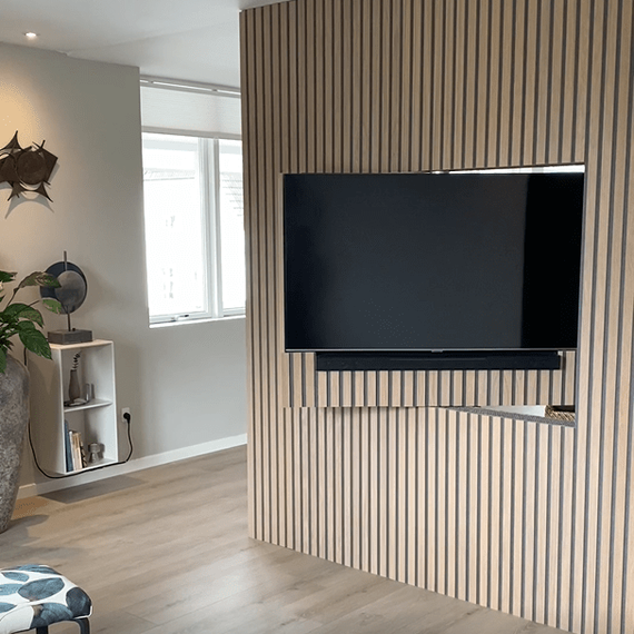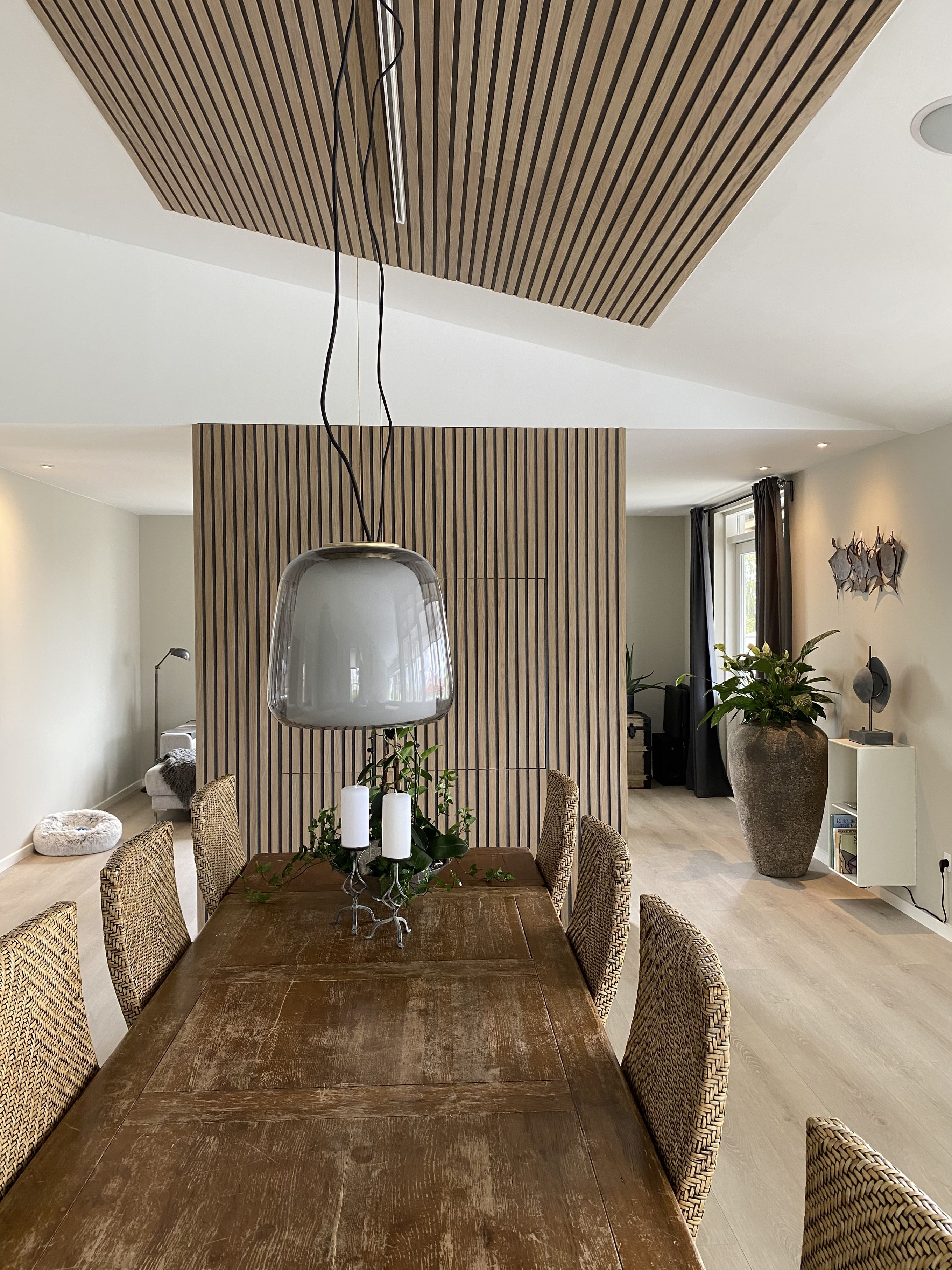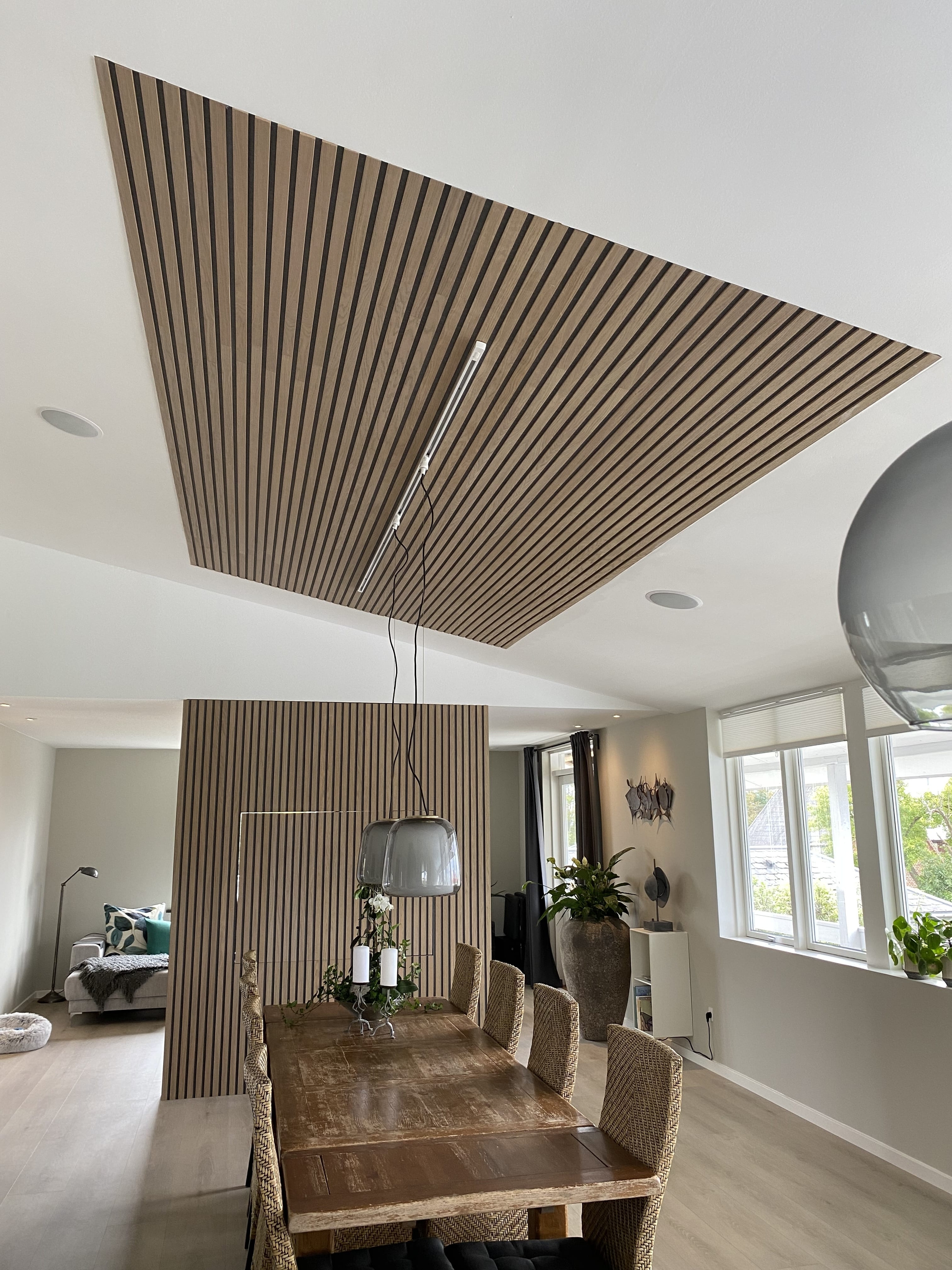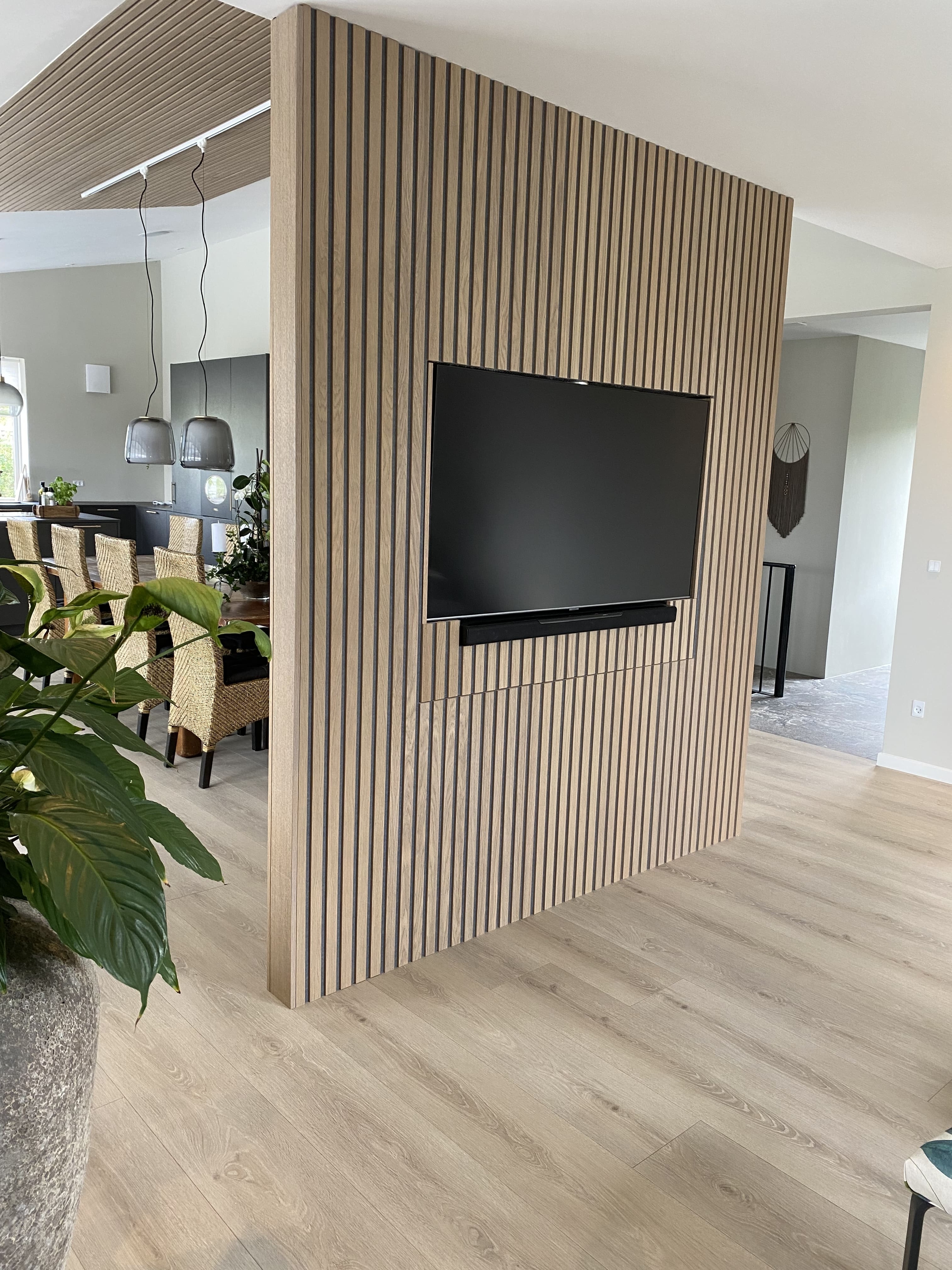 At Heidi Lyhne, we created a special solution so their TV could be turned between the living room and the dining room, while keeping the aesthetics in focus and improving the acoustics. Therefore an I-Wood Denmark® Design was chosen using wall panels and ceiling panels that flow nicely with the rest of the room.