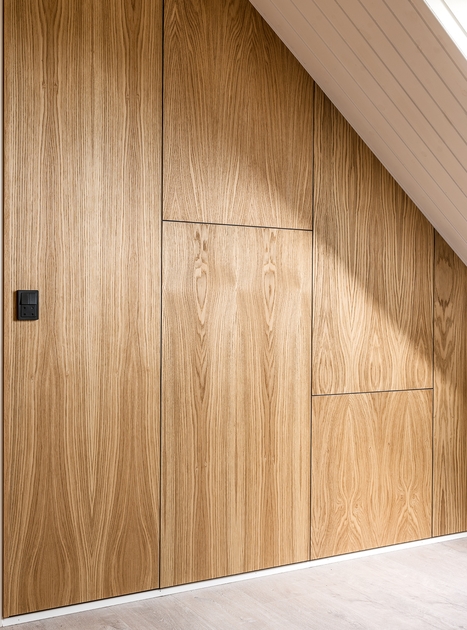 UniPanel® from I-Wood Denmark® is a showcase of an uncompromising blend of aesthetics and craftsmanship, with signature traits from nature and Nordic design. UniPanel® is a flat and unique wooden panel, where the beveled edges accentuate the lines between the panels. Each joint highlights your pattern, while the simple surface is nuanced by the natural wood grain in the distinctive A-veneer.